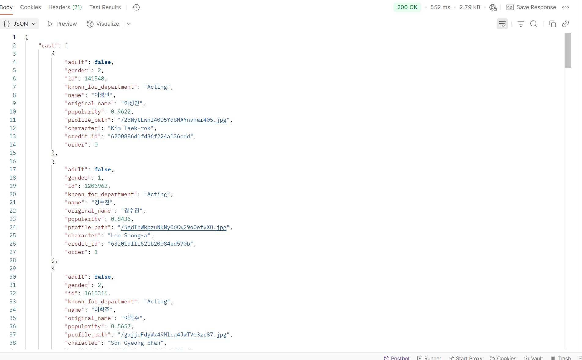 출연진도 받아오고 싶다면 /credits를 추가하면 된다