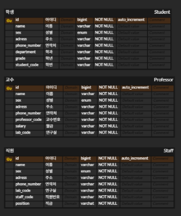 그렇다면 가장 일반적으로 짠다고 생각하면 그냥 학생,교수,직원 3개의 엔티티를 만들고 사람의 공통된 속성(이름,성별,주소,연락처)는 각각의 엔티티의 속성으로 들어가는 것이다.