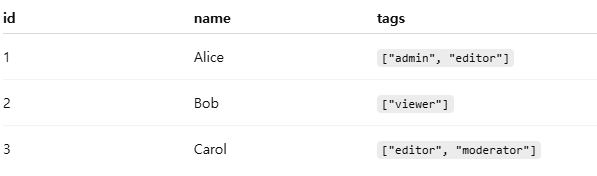 아래와 같은 테이블이 user테이블이라면 JSON형식의 배열이 담긴 tags칼럼에 "admin" 값을 가진 Alice가 조회되는 것이다.